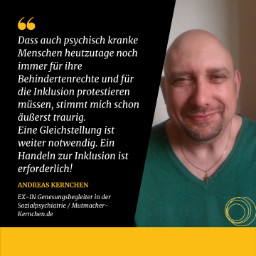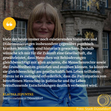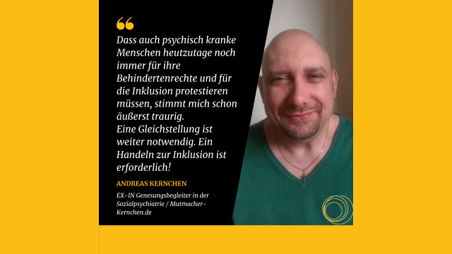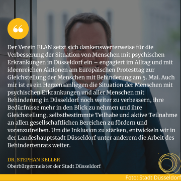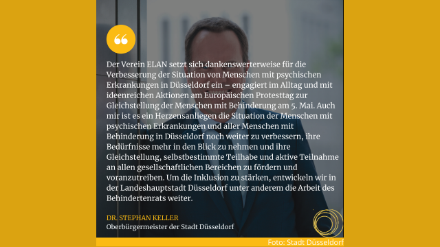 Der 5. Mai ist seit über zwanzig Jahren ein fester Termin: In ganz Europa wird für die Gleichstellung von Menschen mit Behinderung protestiert. Auch im zweiten Corona-Jahr gibt es unzählige Aktionen, und der Verein ELAN macht mit. Wir haben in bunter Form – von Psychiatrieerfahrenen bis zum Oberbürgermeister – kurze persönliche Statements gesammelt zu der Frage „Wie stellen Sie sich die inklusive Welt von morgen für psychisch erkrankte Menschen vor?“ Die Statements sehen Sie unten.